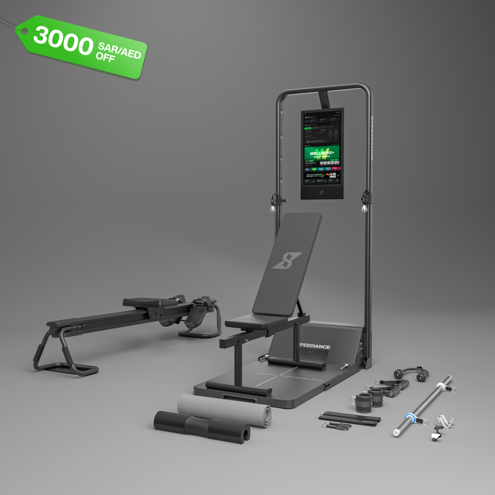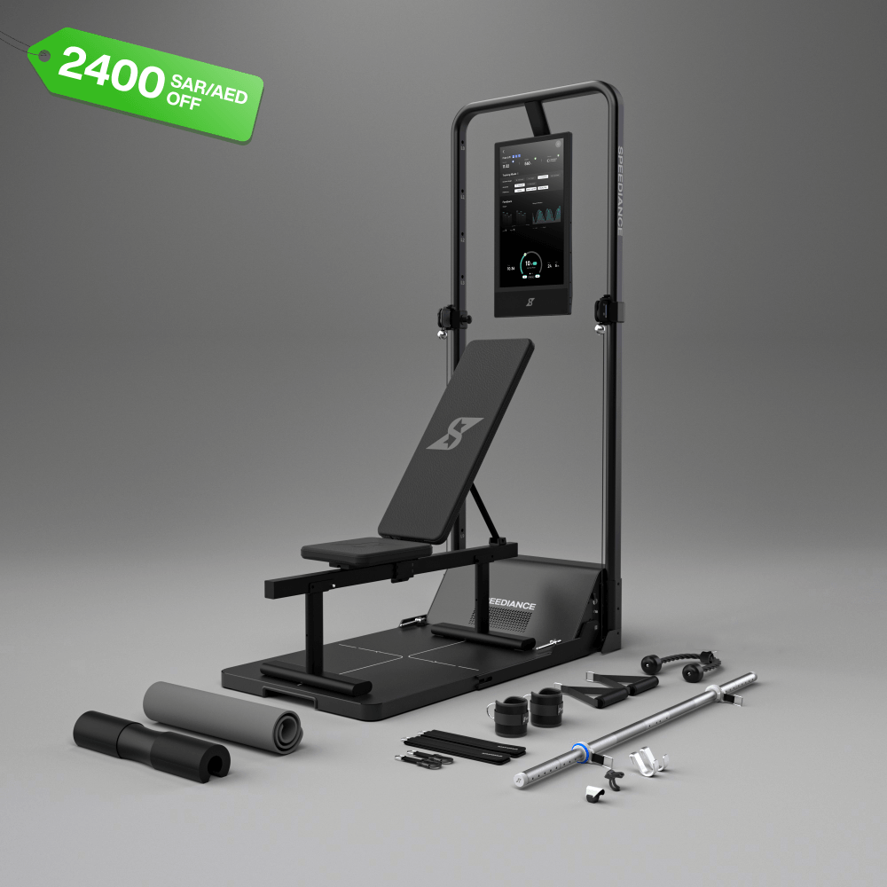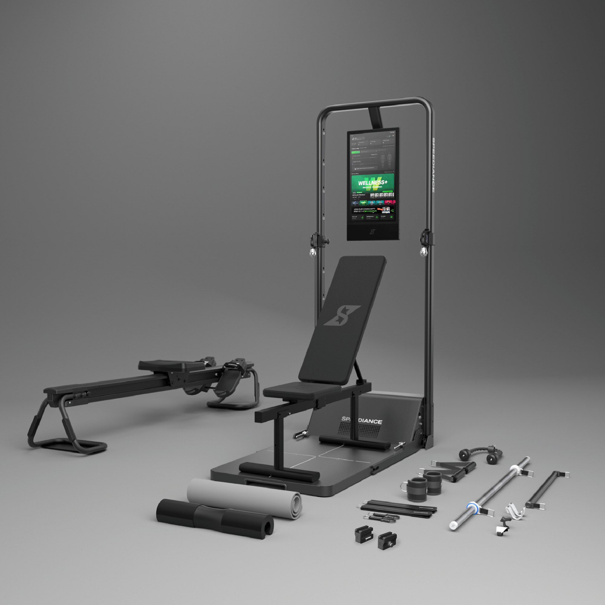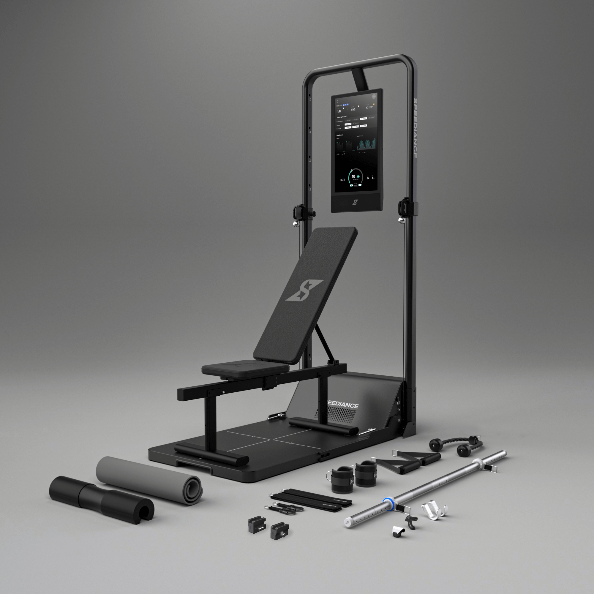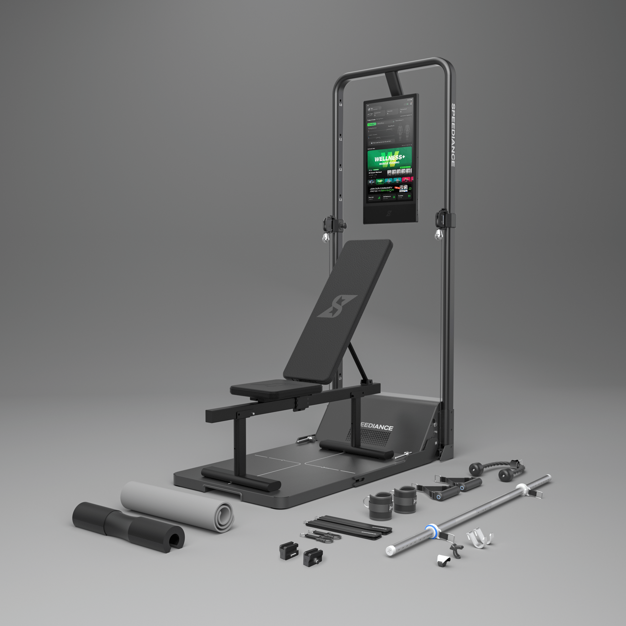 With various attachments such as a barbell, smart handles, tricep rope, ankle straps, ski handles, and a rowing bench, you can perform a wide range of exercises that typically require a trip to the gym using this machine. Some examples include classic squats, bench presses, deadlifts, chest flies, lat pulldowns, rowing, skiing, and many more, which can provide you with a truly immersive gym experience.