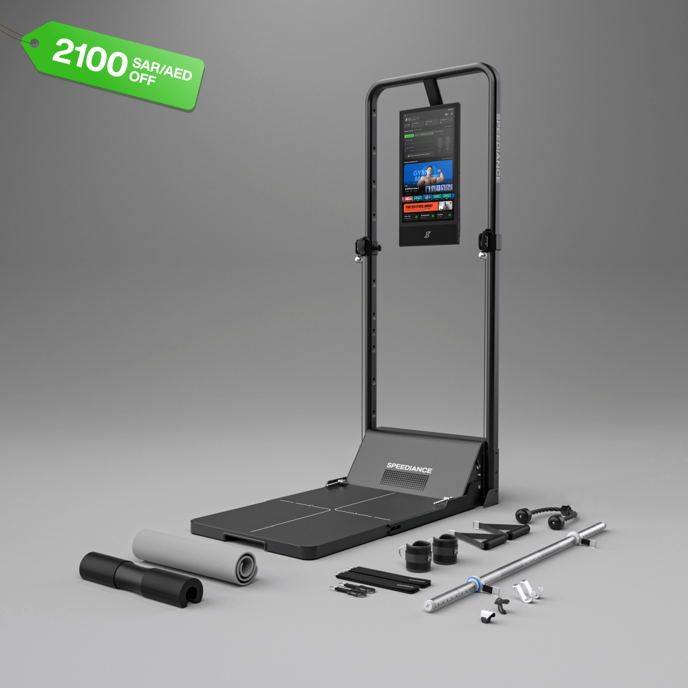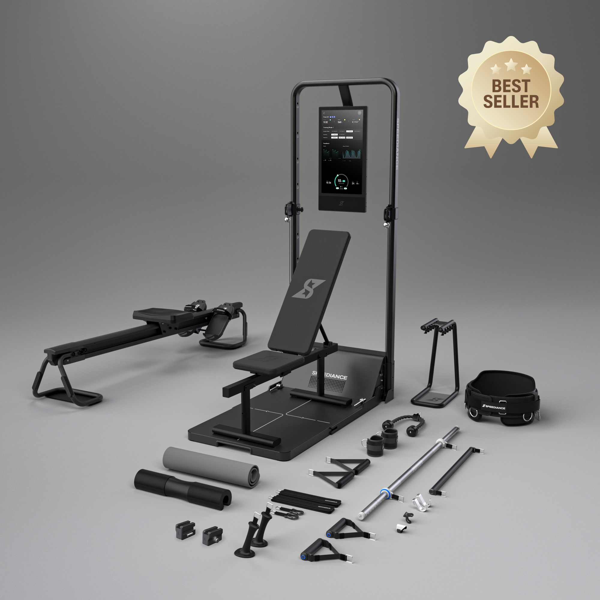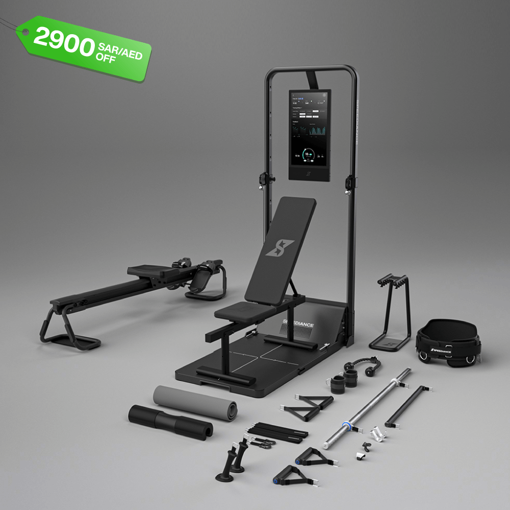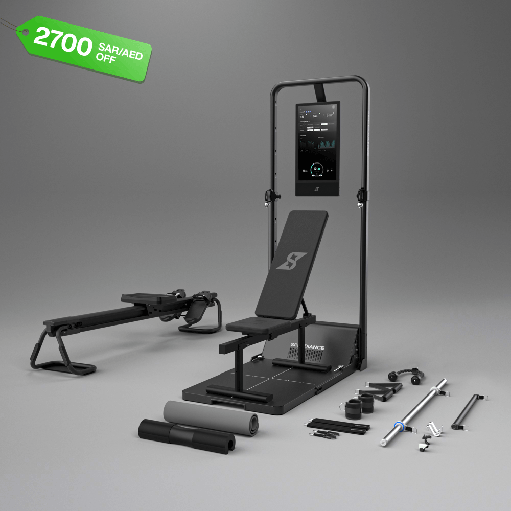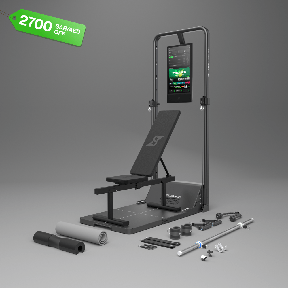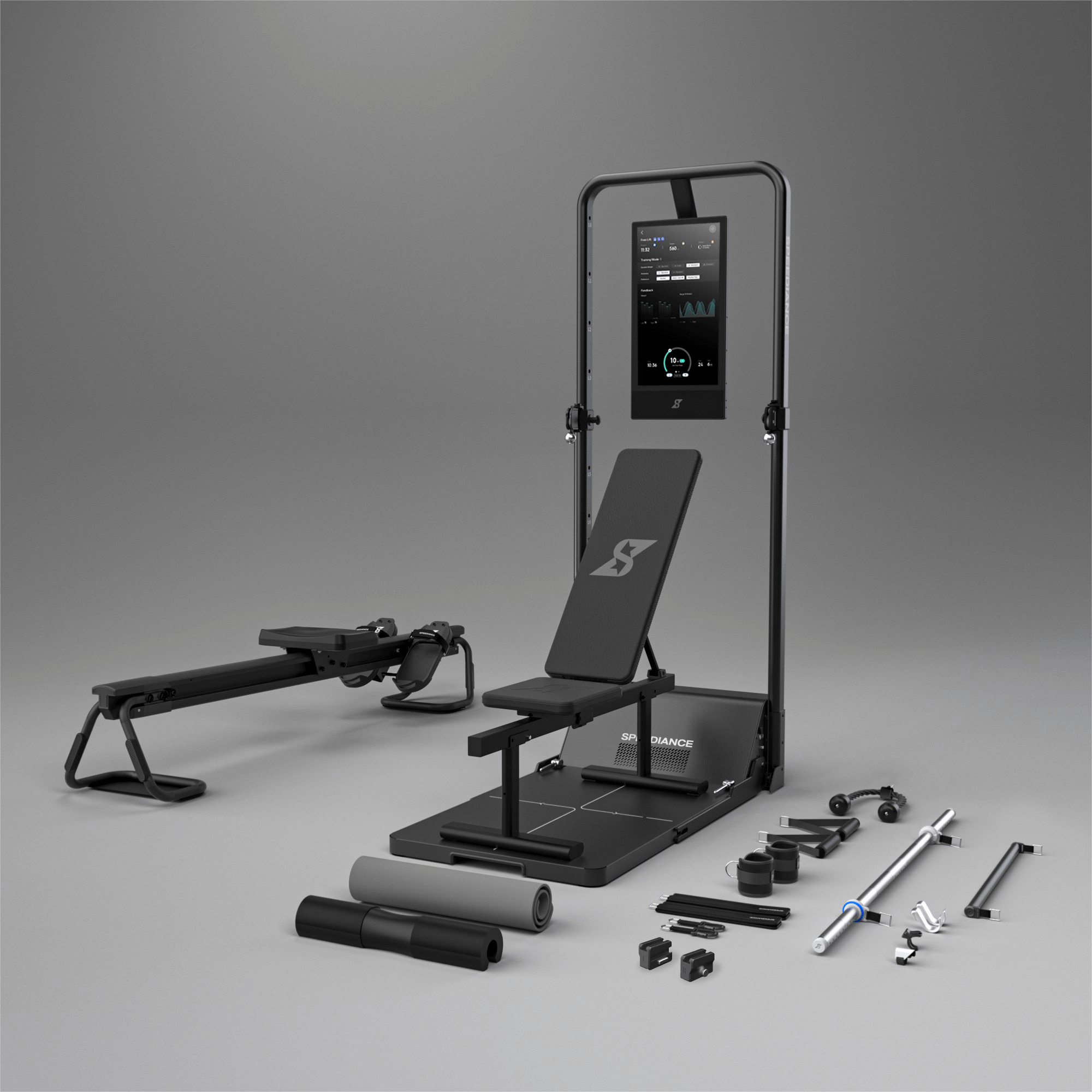 With various attachments such as a barbell, smart handles, tricep rope, ankle straps, ski handles, and a rowing bench, you can perform a wide range of exercises that typically require a trip to the gym using this machine. Some examples include classic squats, bench presses, deadlifts, chest flies, lat pulldowns, rowing, skiing, and many more, which can provide you with a truly immersive gym experience.
